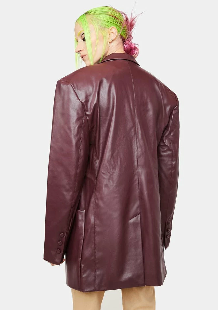 has a vegan leather construction, padded shoulders and buttoned cuffs, front pockets, and front button closures.