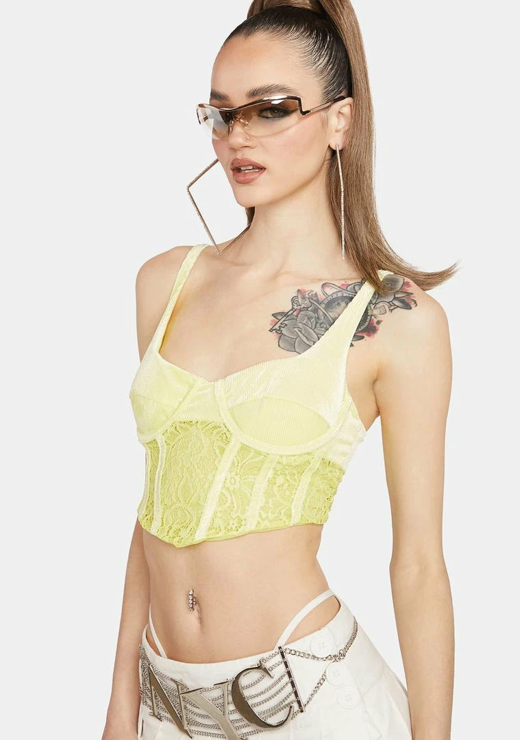 cuz you brighten my day. This corset top comes with ribbed cupping, a lace underbust with corset stitching, adjustable straps, and a ribbed and lace back with hook and eye closures.