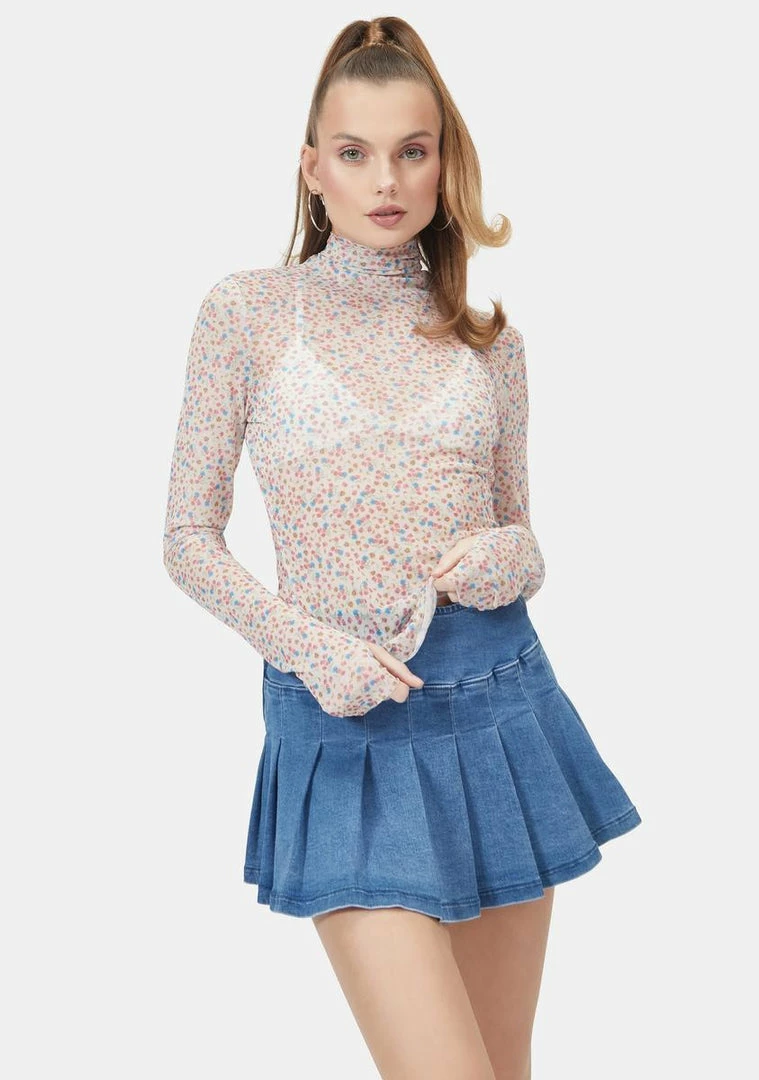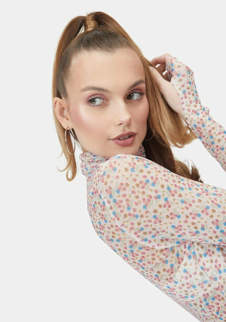 cuz youΓ’ΒΒre here today, gone tomorrow! This chic turtleneck top has a semi sheer mesh construction, long sleeves with thumbhole cuffs, and sweet floral graphics all over.