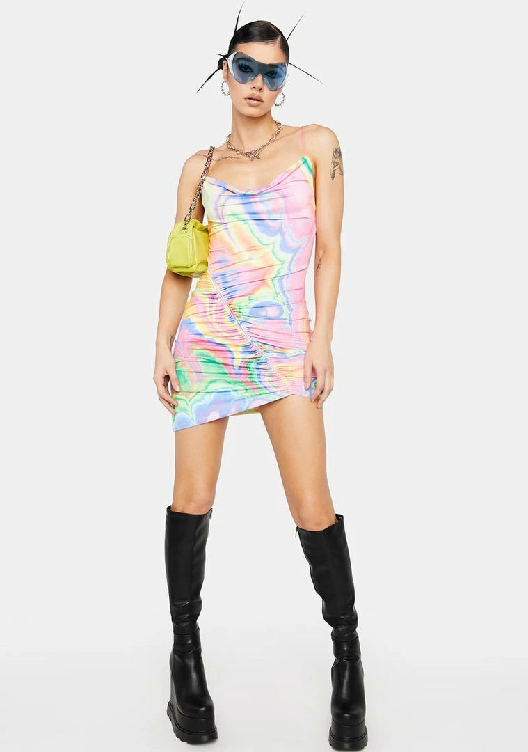cuz they can’t deny you, babe! This fitted slinky knit mini dress has a ruched construction, a cowl neckline, adjustable shoulder straps, an asymmetrical hemline, and a colorful marble print all over.