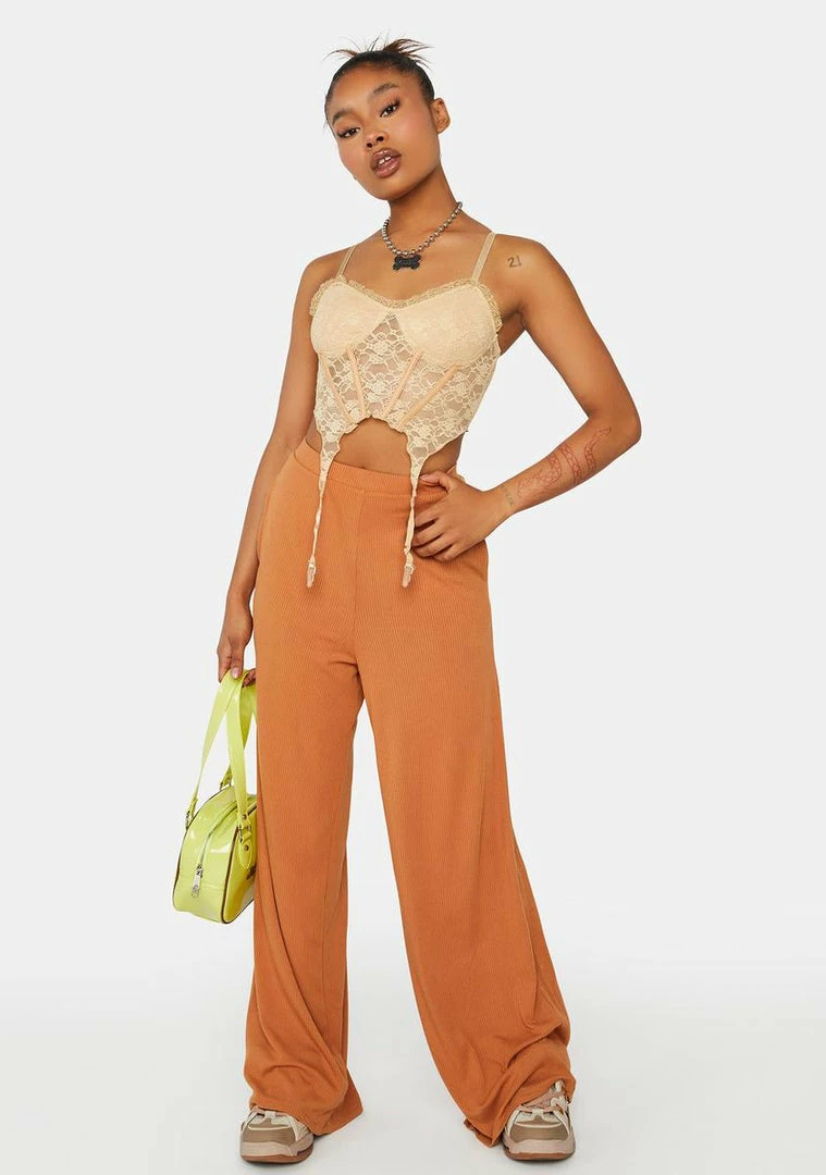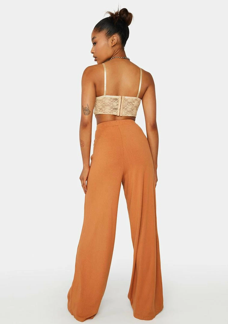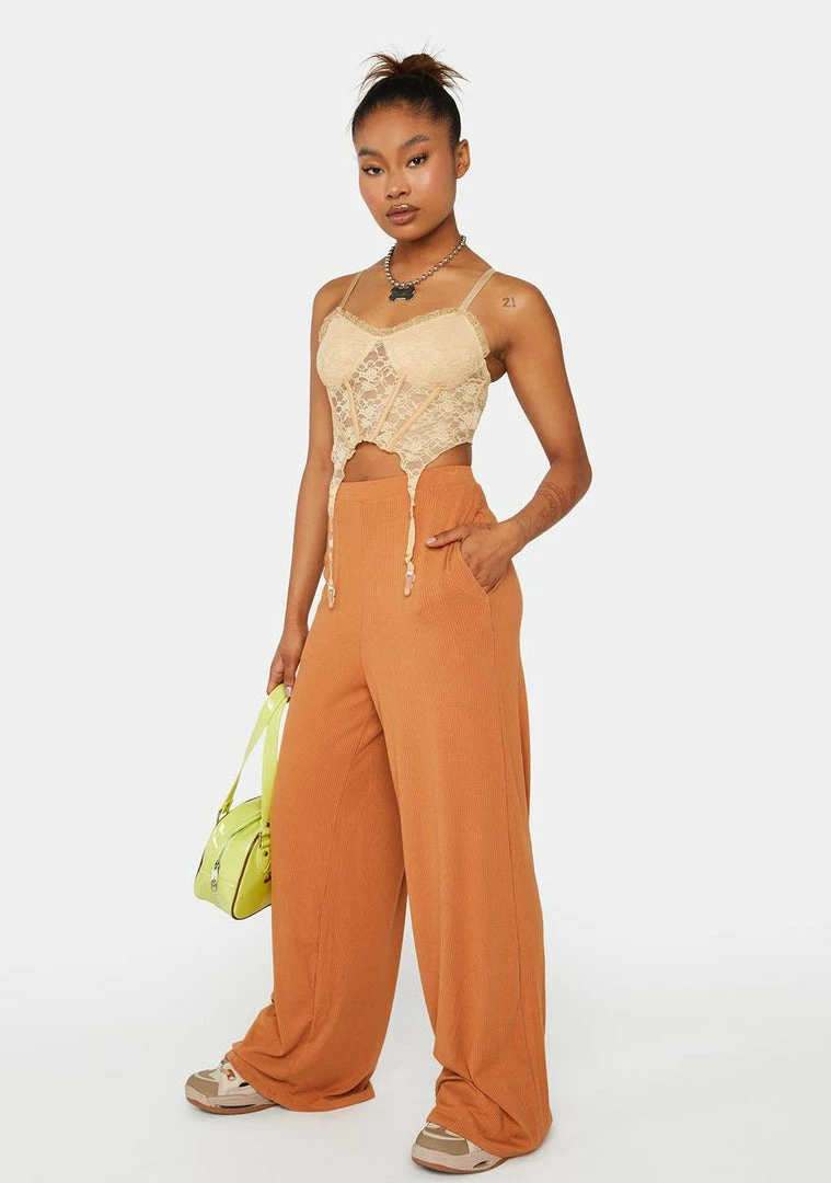 have a ribbed construction, pockets on the sides, a wide leg design, and an elastic waistband.