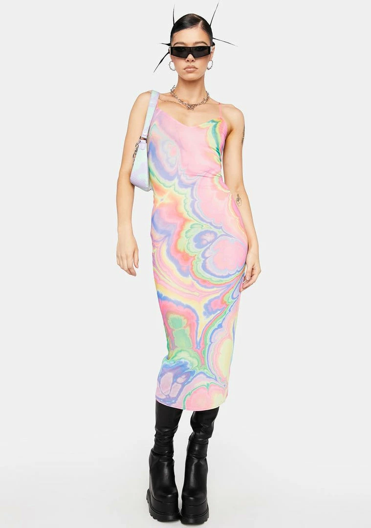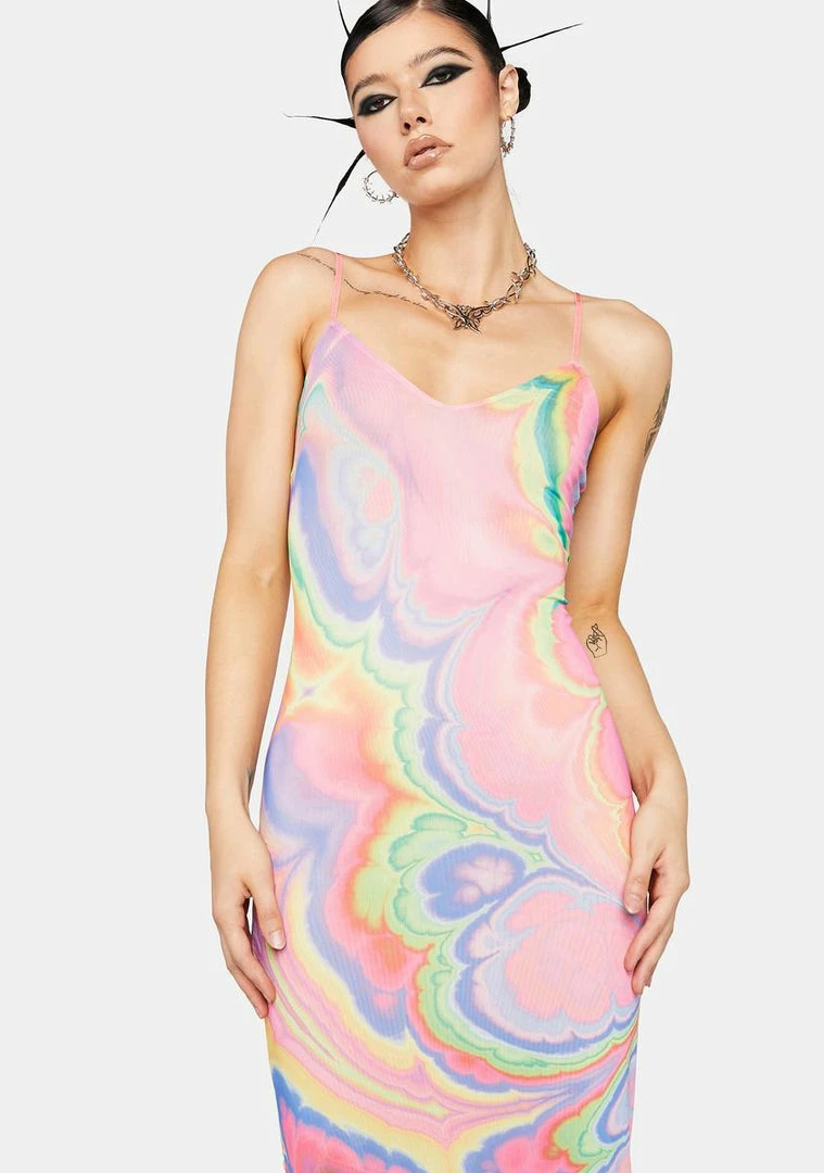 cuz you keep it sassy! This fitted mesh midi dress has adjustable shoulder straps, a full lining, and a colorful marble print all over.