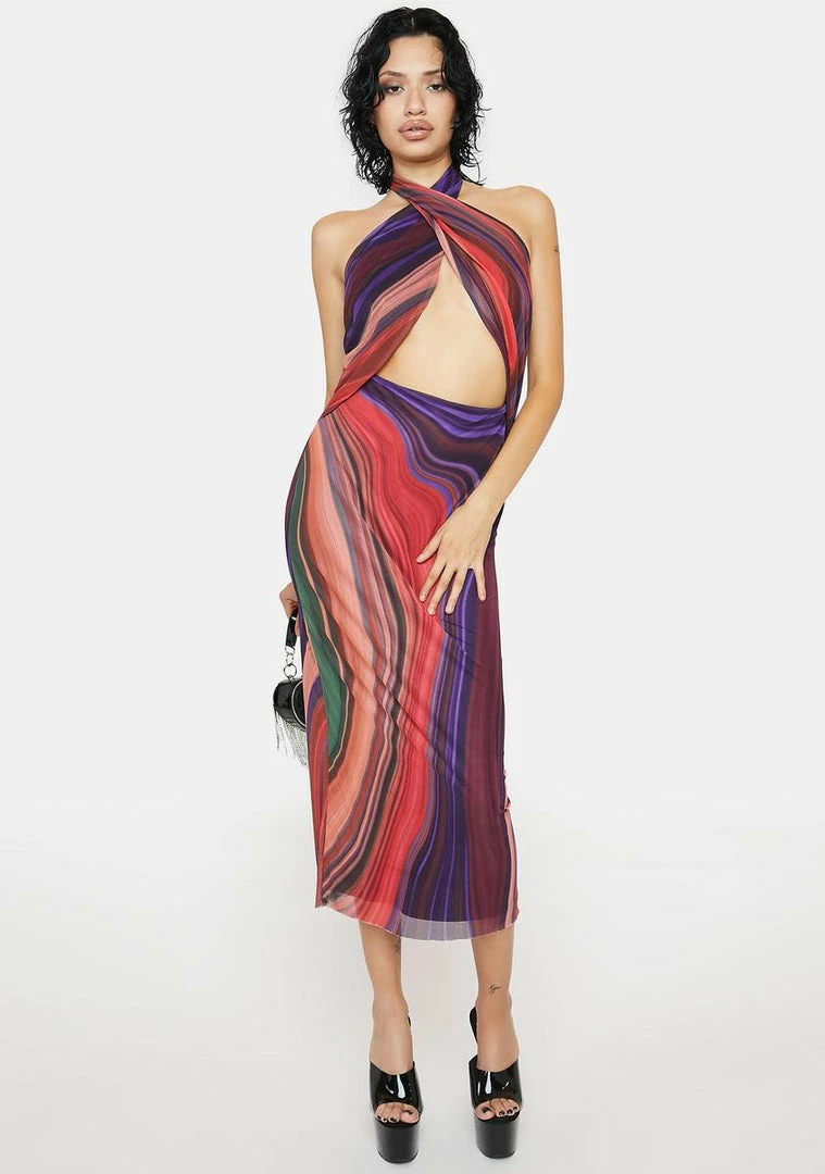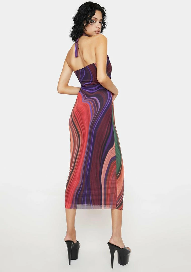 has a mesh construction, a cut out design, a halter neckline, an adjustable tie closure, and a swirl abstract print all over.
