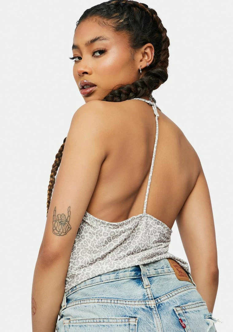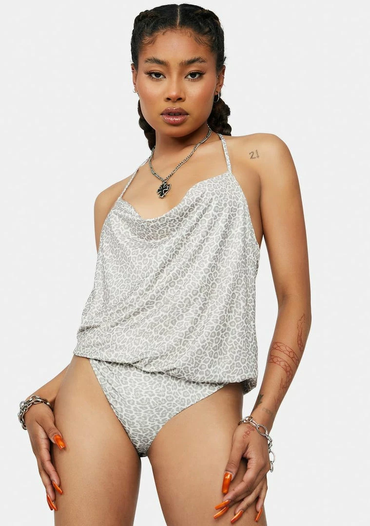 cuz you know how to be fierce. This slinky knit bodysuit has a plunging cowl neckline, an adjustable T-back strap design, a thong silhouette, and a leopard print all over.