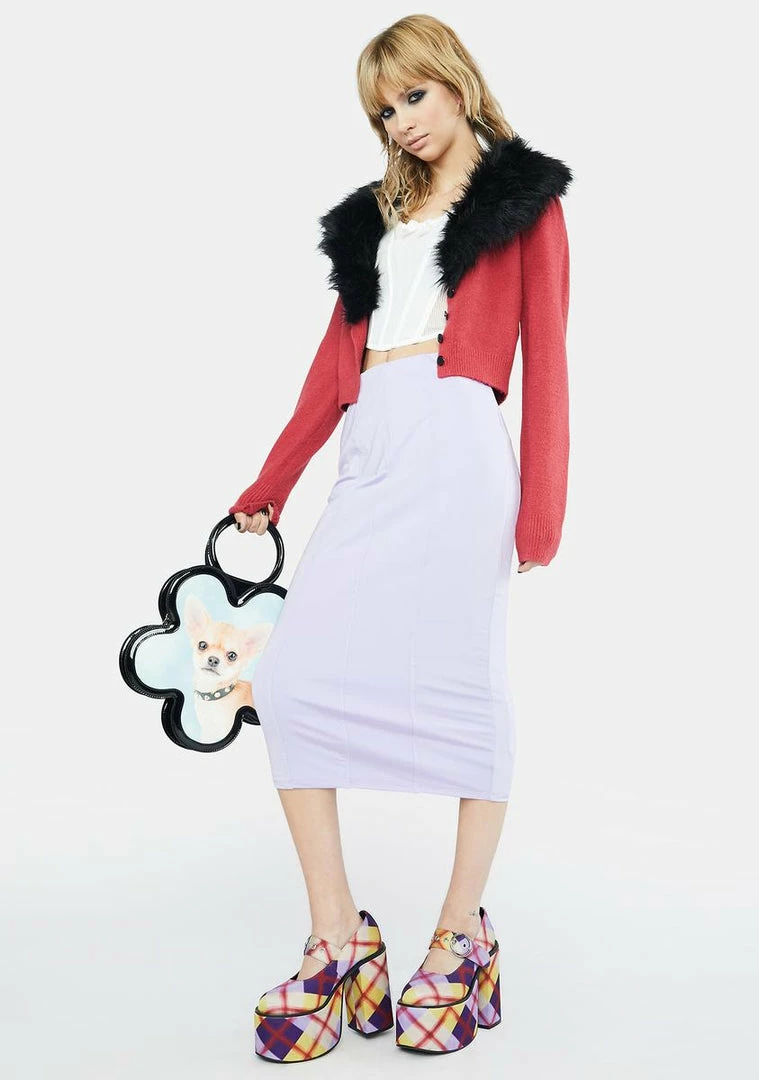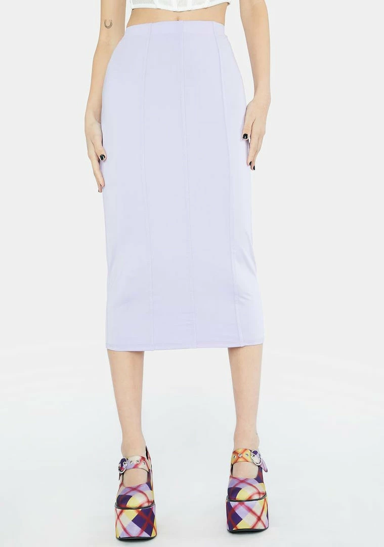 has a high rise waistline, a midi length, a bodycon fit, and a structured panel design.
