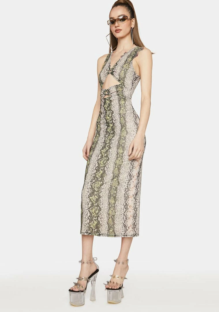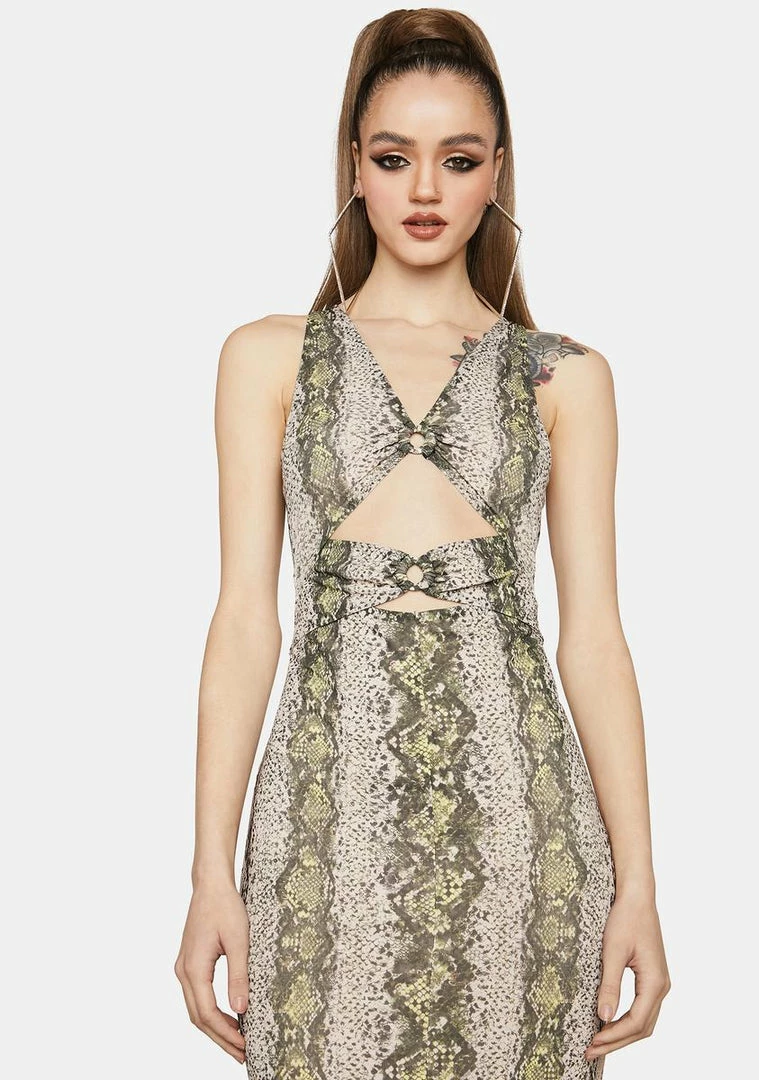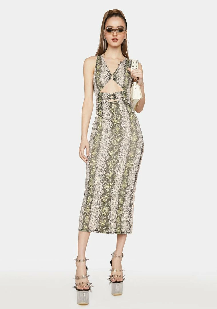 cuz you stay serving attitude. This bodycon midi dress is sleeveless, with a v-neckline, cut outs below the chest, ring cut outs, and a snake print all over.