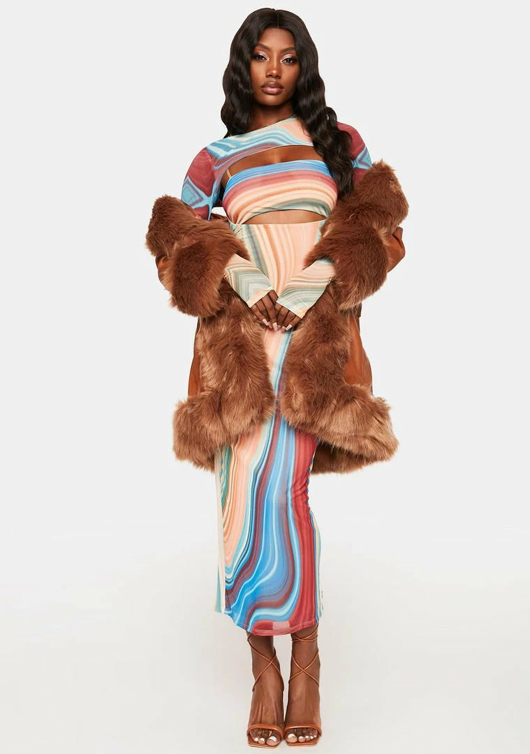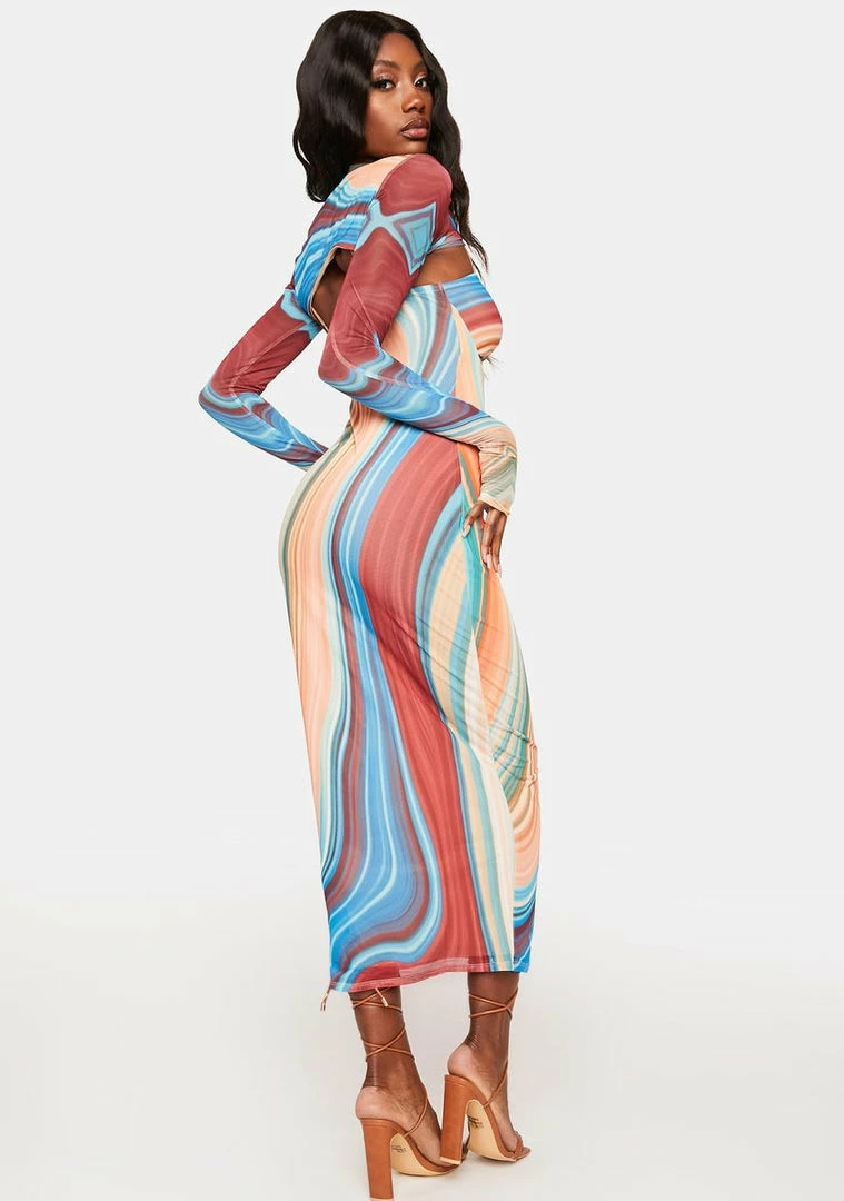 This midi dress has a mesh construction, a removable shrug, long sleeves with thumbhole cuffs, adjustable shoulder straps, a cut out design, an open back with adjustable lace-ups, a marble print all over, and a bodycon fit.
