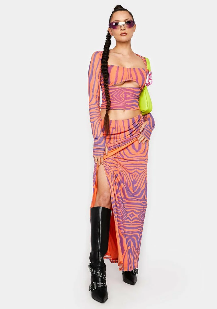 cuz youΓ’ΒΒre a wild soul! This ruched midi skirt has an elastic waistband, a high leg slit, and a zebra print all over.