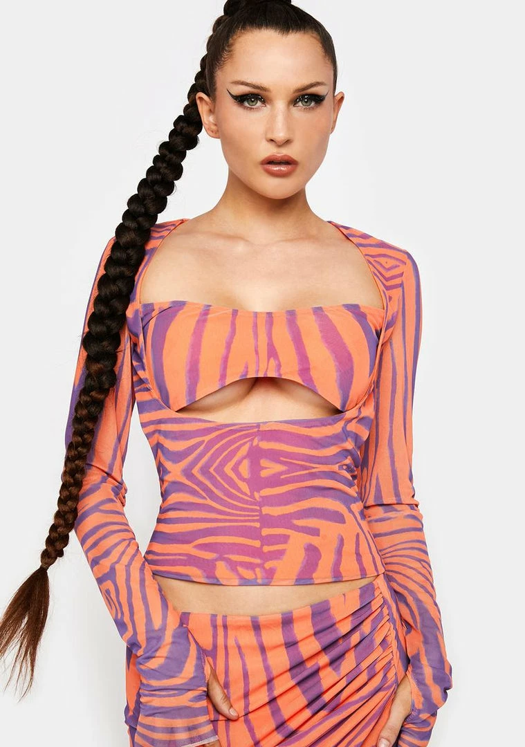 cuz youâre a wild soul! This underboob cut-out top has a square neckline, long sleeves with thumbhole cuffs, a built-in bandeau design, and a mesh construction with a zebra print all over.