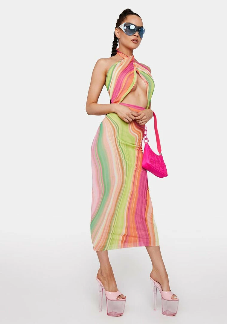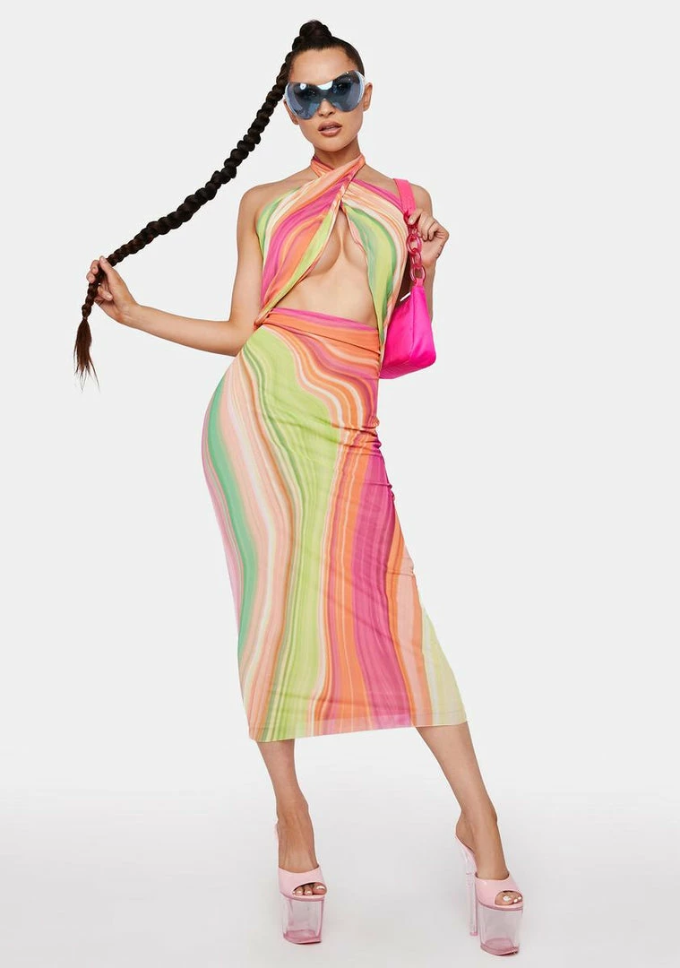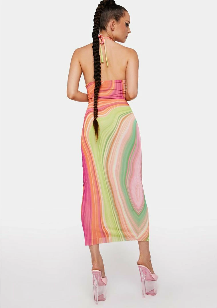 give ’em trippy feels! This mesh midi dress has a front cut-out design, a criss-cross wrap halter neckline, adjustable tie closures at the neck, an open back, and a colorful wave print all over.