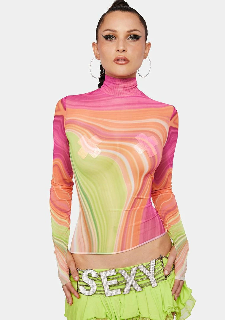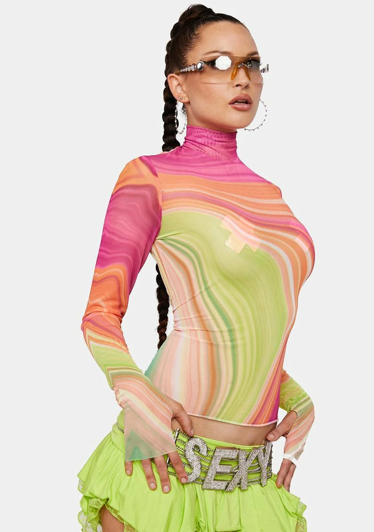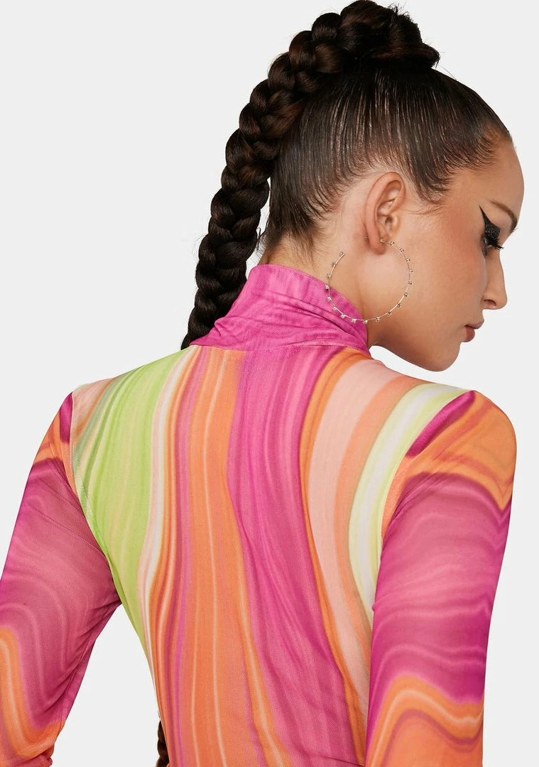 give ’em trippy feels! This mesh turtleneck top has long sleeves with thumbhole cuffs, a bodycon fit, and a colorful wave print all over.