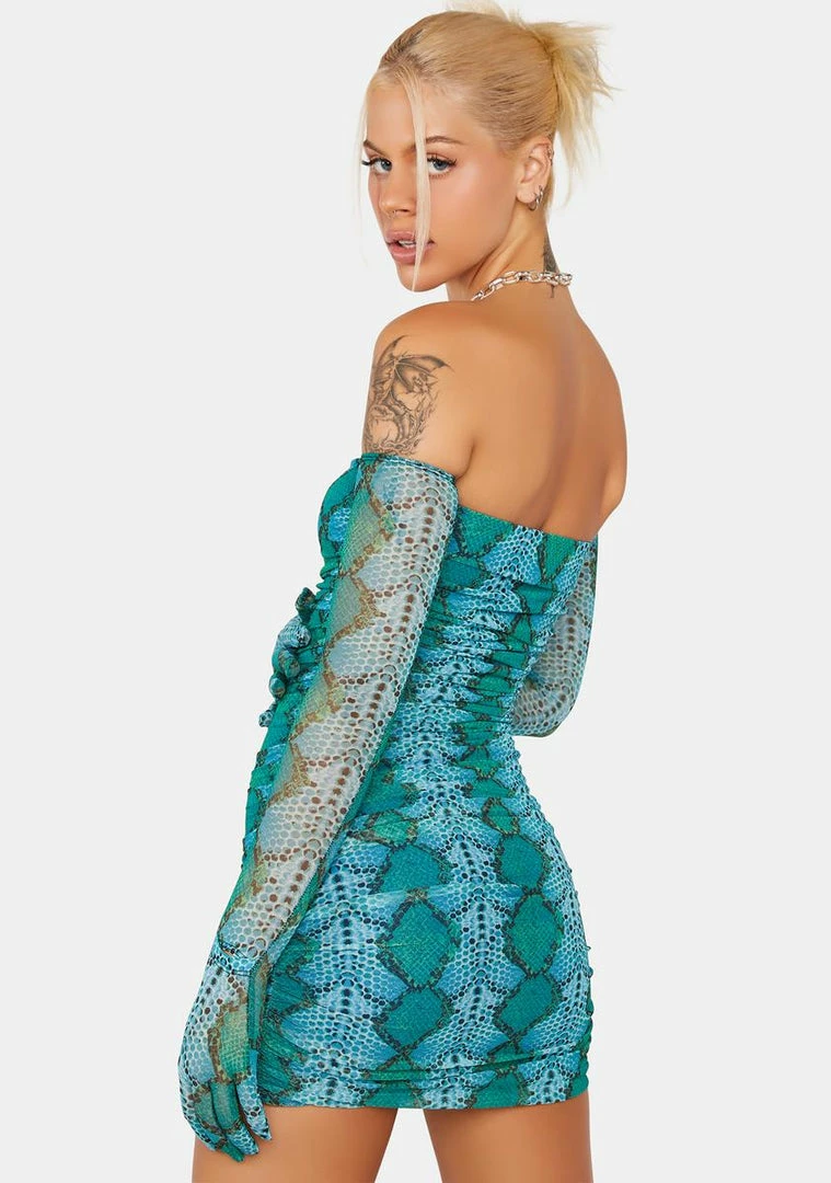 cuz you’ll have ’em slippin’ under. This mini dress and long gloves set has a ruched mesh construction, a bodycon fit, and a snakeskin print all over.