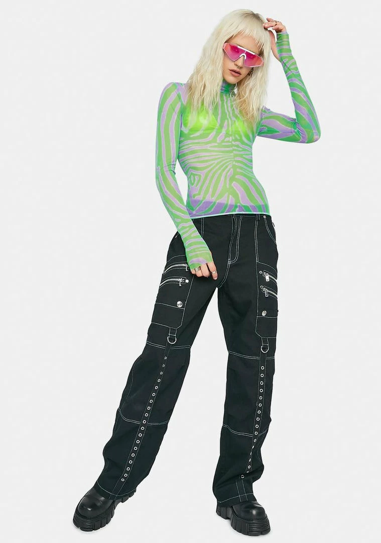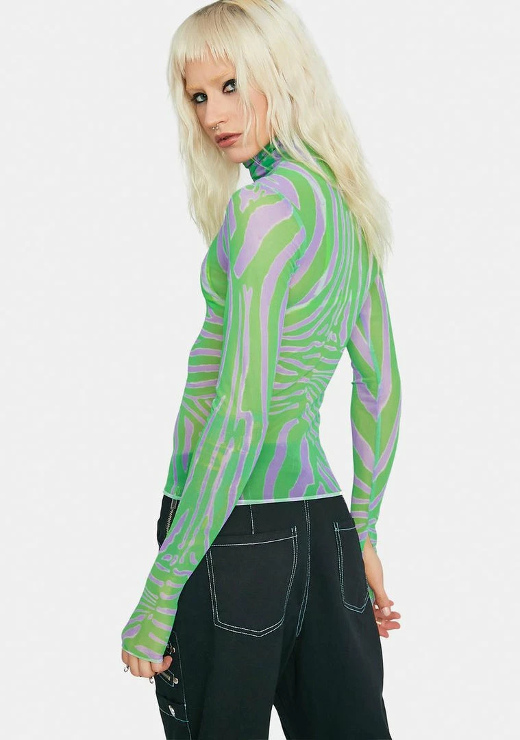 cuz you make it roar. This long sleeve mesh top has a zebra print and a turtleneck.