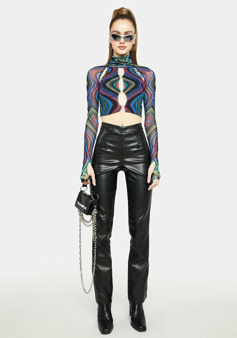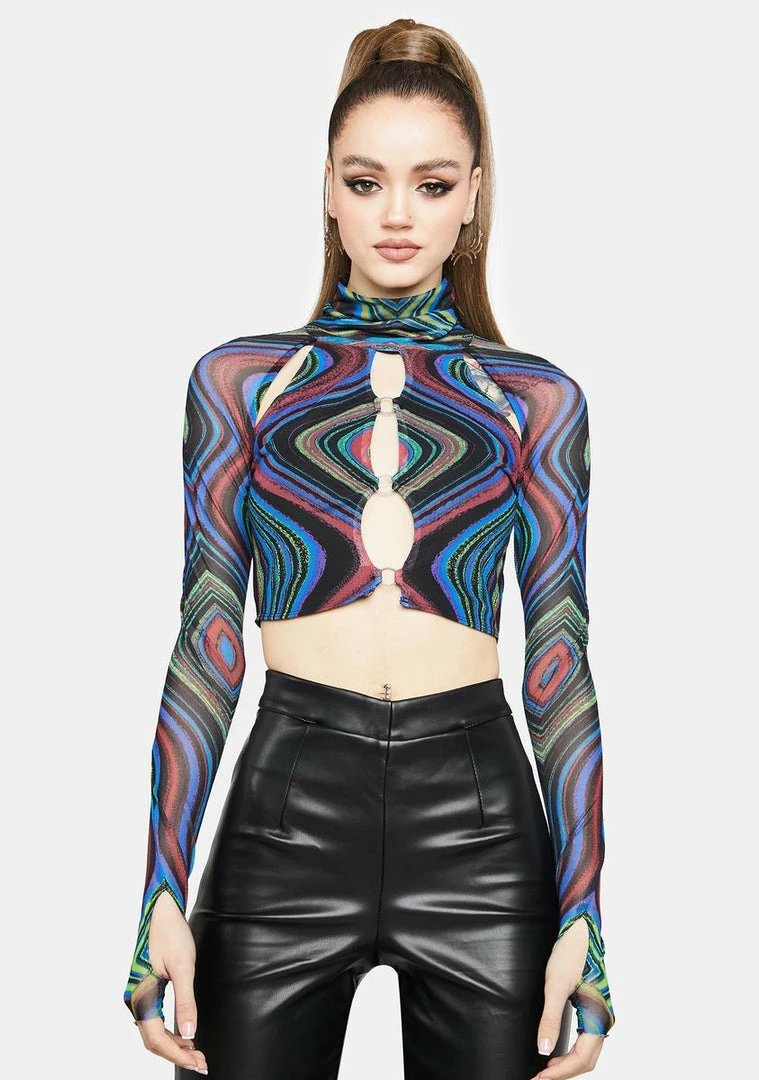 give รขยยem psychedelic sass! This stretchy mesh turtleneck top has a cropped fit, long sleeves with thumbhole cuffs, front cut-outs with O-ring hardware, and an electric swirl print all over.