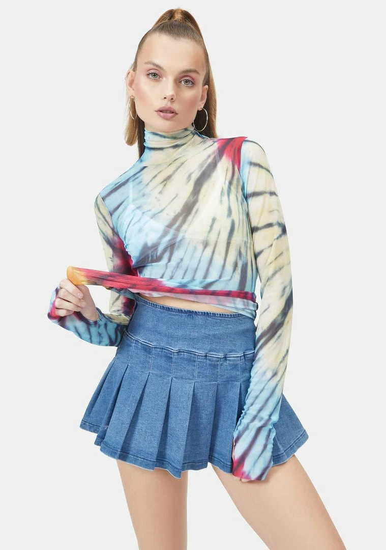 cuz youΓ’ΒΒre here today, gone tomorrow! This chic turtleneck top has a semi sheer mesh construction, long sleeves with thumbhole cuffs, and a groovy tie dye print.