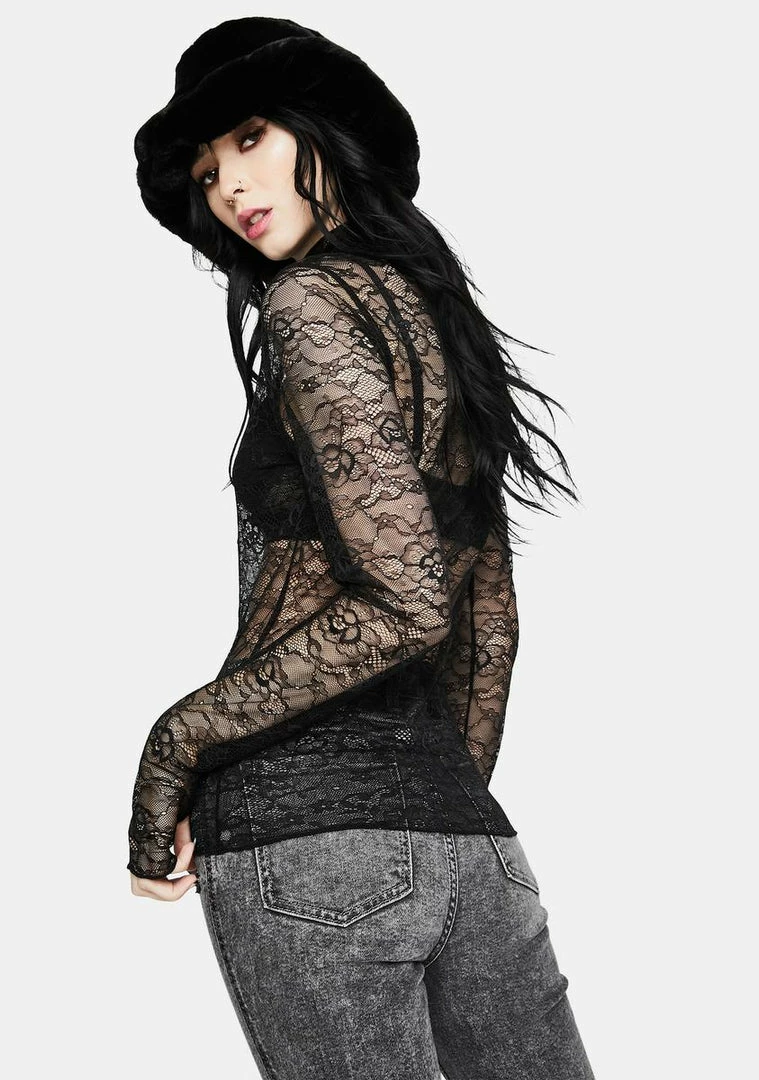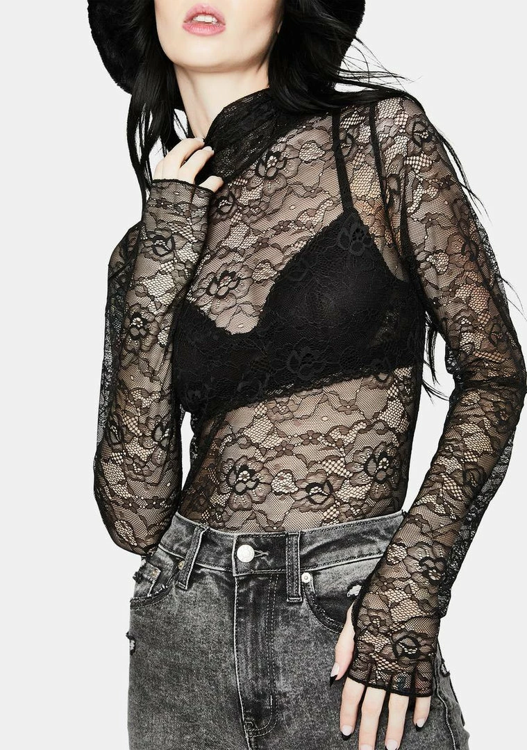 has a sheer lace construction, a mock neckline, and long sleeves with thumbhole cutouts.
