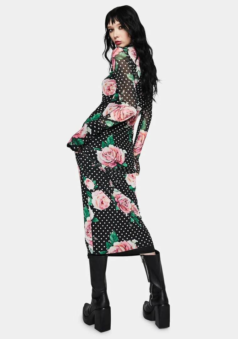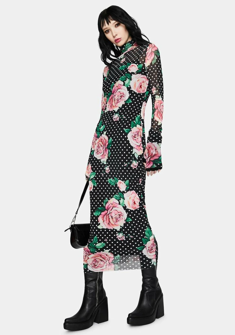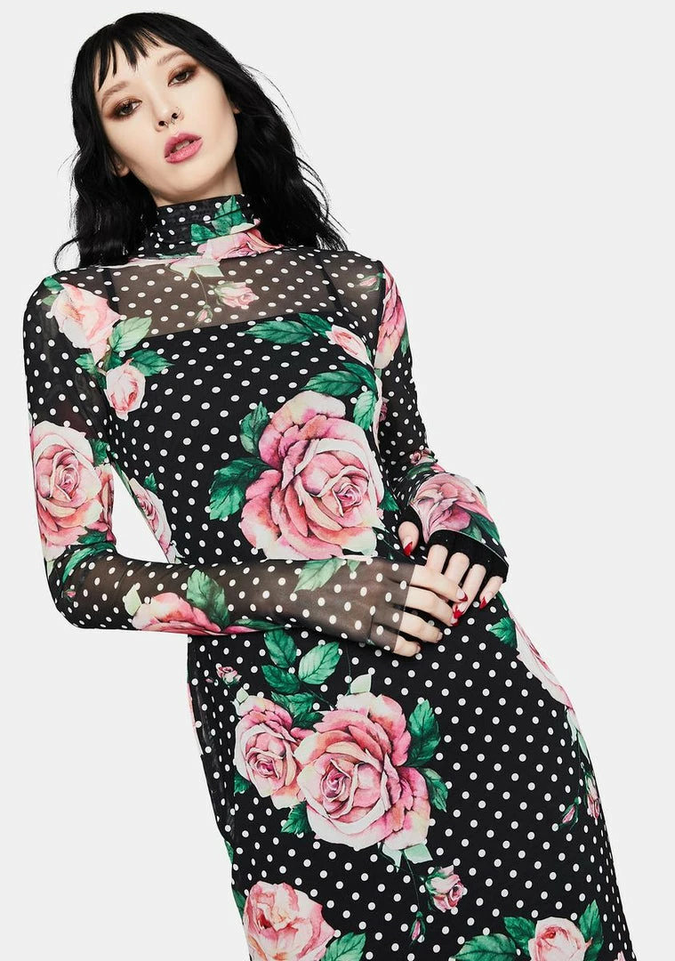 cuz youΓ’ΒΒre here today, gone tomorrow! This sheer mesh midi dress has a floral polka dot all over, a turtle neckline, and thumbhole details.
