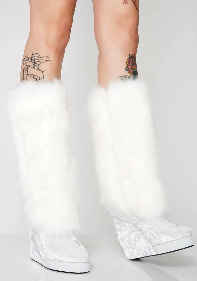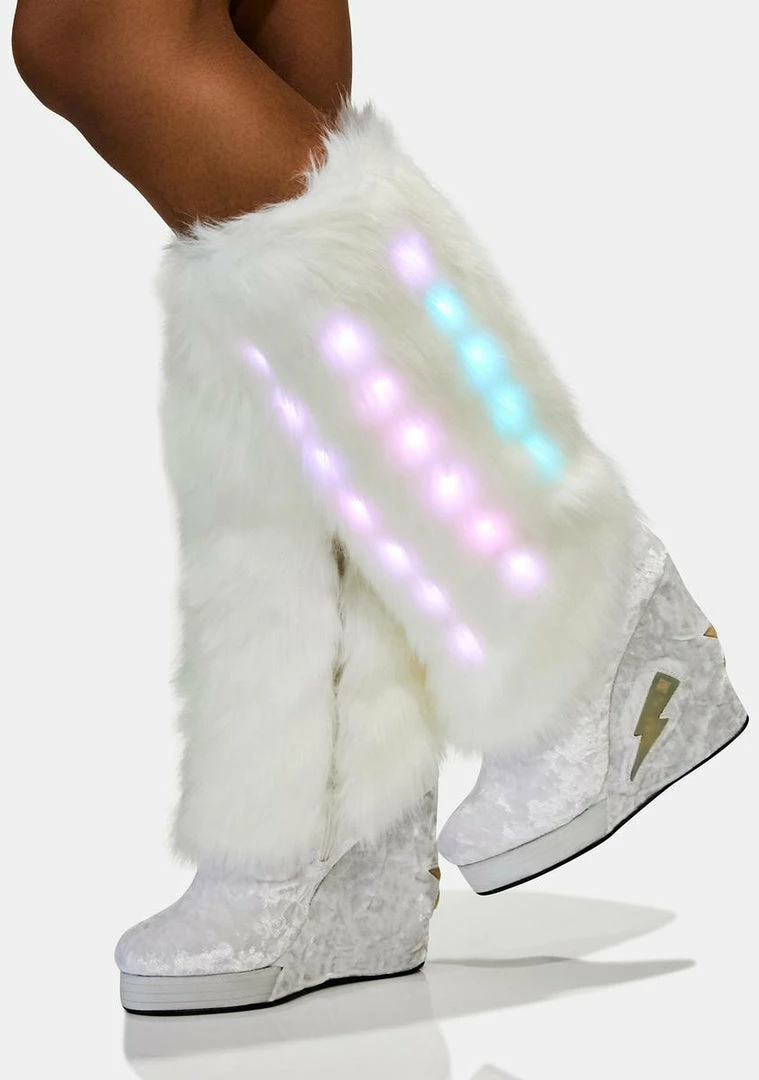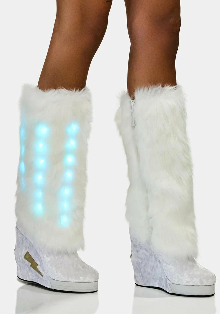 and ur right in the middle of it. These dope boots have a fuzzy Nรขยย velvet exterior, wedge heels with lil lights inside, and inside zipper closures.