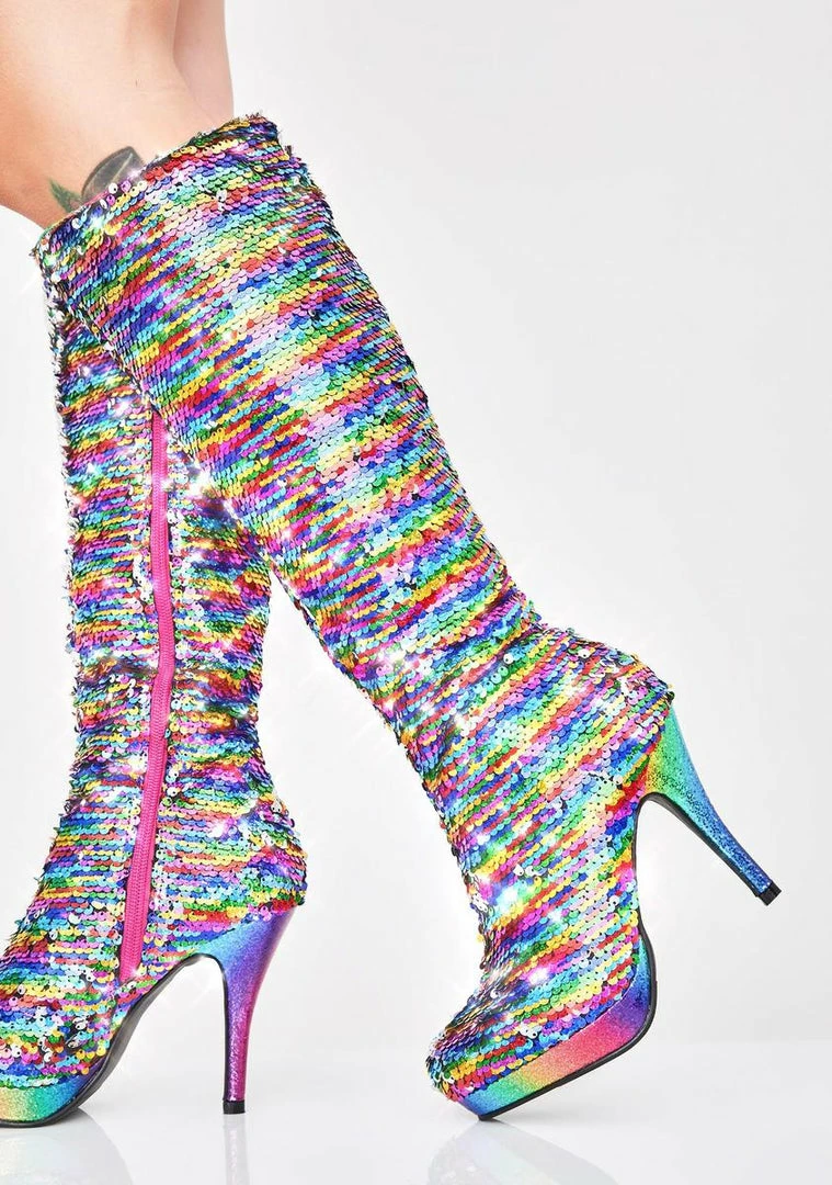 got ya in a disco daze bb! ItΓ’ΒΒs a party in these wild knee high boots that have a shimmerinΓ’ΒΒ flip-sequin construction, slim heels NΓ’ΒΒ inside zip closures.