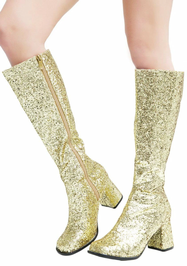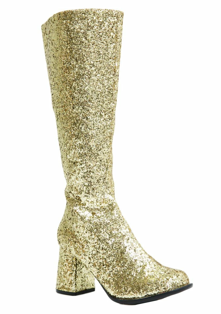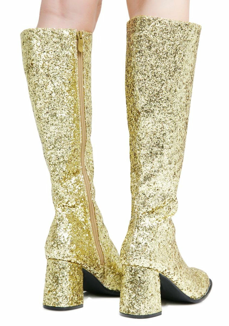 will keep ya movinΓ’ΒΒ all night. These shimmery boots have a supa glittery gold exterior and an inside zipper closure.