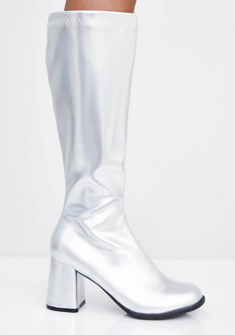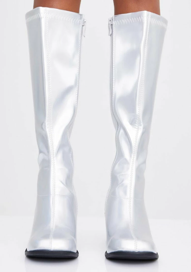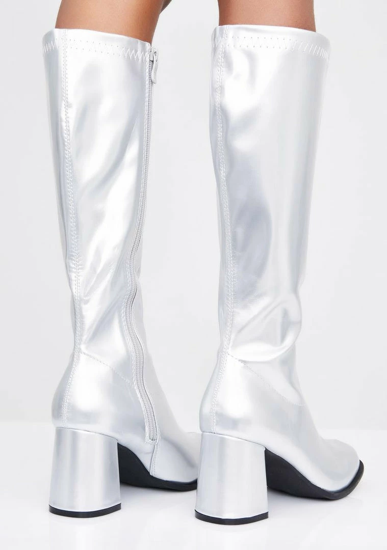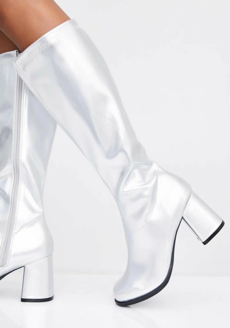 got ya feelinâ so spacey! Throw it back in these patent knee high boots that have chunky heels, pointed toes and side zip closures.
