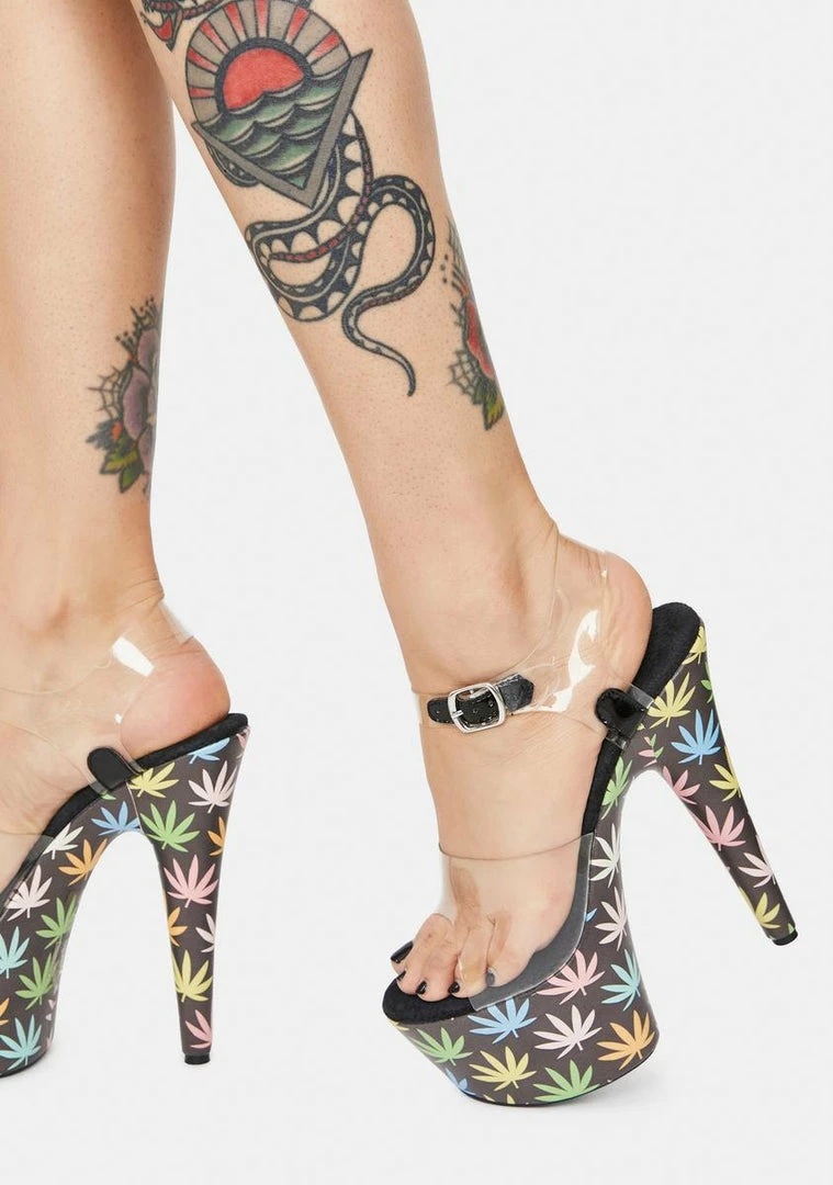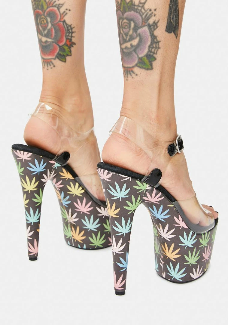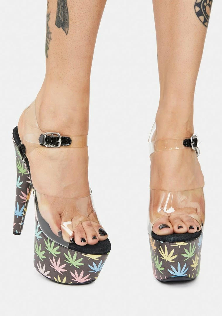 top shelf only! These platform stiletto heels have clear straps and a leaf print all over.