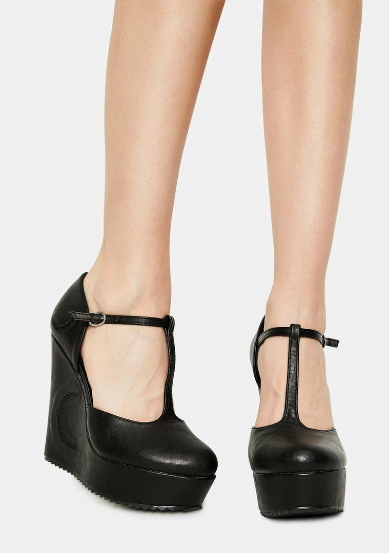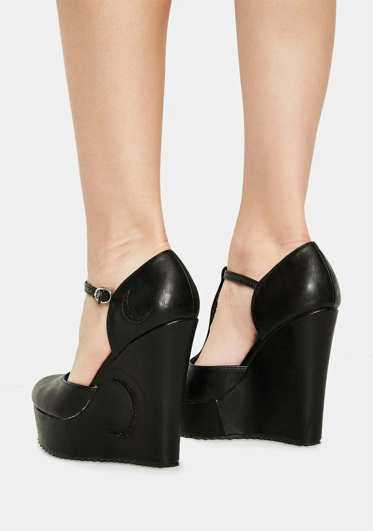 cuz you have your head in the clouds. These wedges have a moon design and buckle closure.