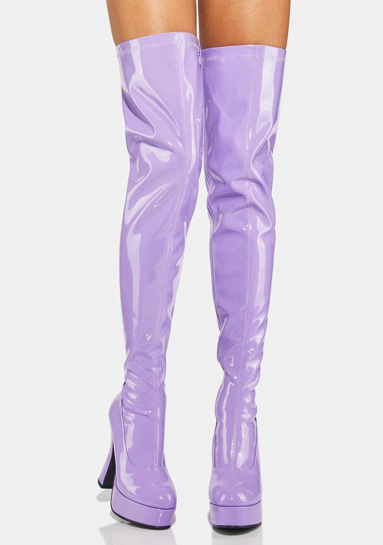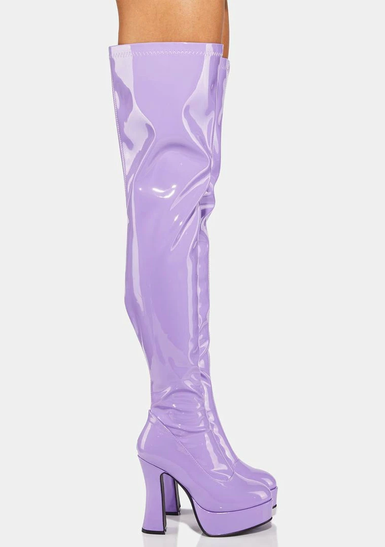 take ’em on a ride, babe. These patent vegan leather thigh high boots have side zip closures, platform soles, and stacked heels.