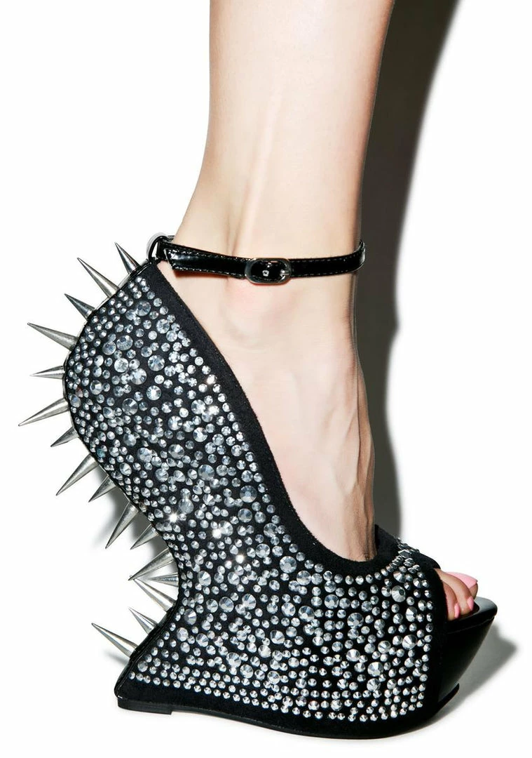 Viola Spiked Wedges, Voila! Here they are… The ultimate statement piece pump! These totally badazz rockstar wedges feature a peep toe, a thin adjustable buckle ankle strap, long spike accents down the back and sparklin’ studs all over! Yer also gonna stand high n’ mighty in these amazingly eye-catching wedges thanks to a 2″ concealed platform and 6″ wedge heel! If yer the kind who likes to stand out and really push yer wardrobe to the edge, we can’t think of a better way than with these totally sikk wedges!