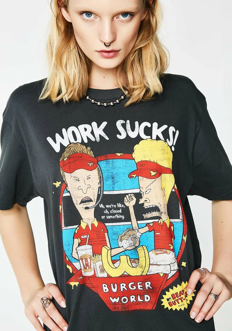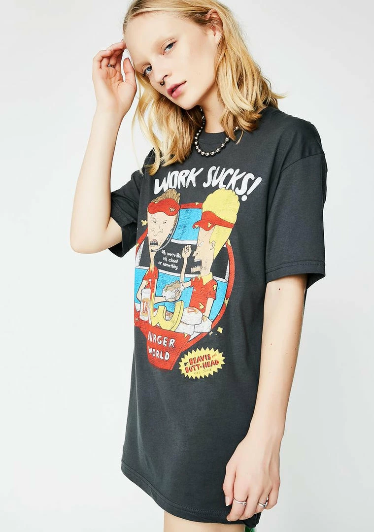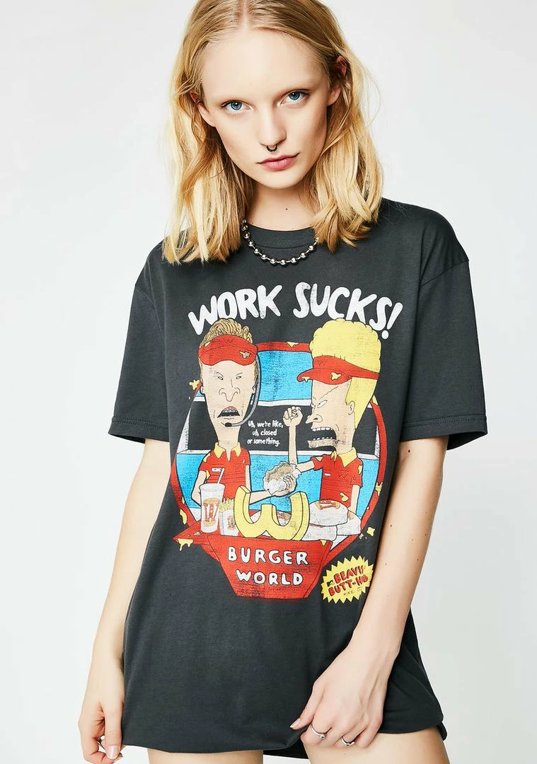 cuz thinking sucks. Get in some trouble with this dark gray tee that has a graphic on the front of your two favorite teenage delinquents.
