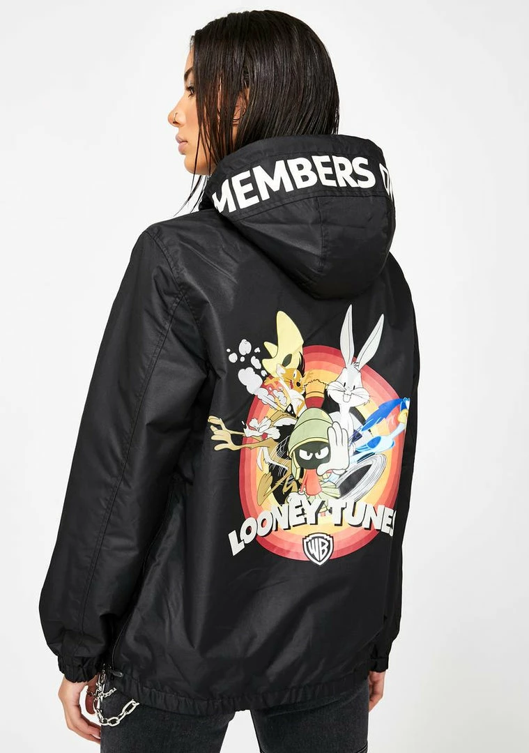 gotcha totally buggin’ out, babe! Go looney for ’em in this rad popover jacket that has iconic graphics on the back, a quarter zip closure and adjustable drawstring hood.