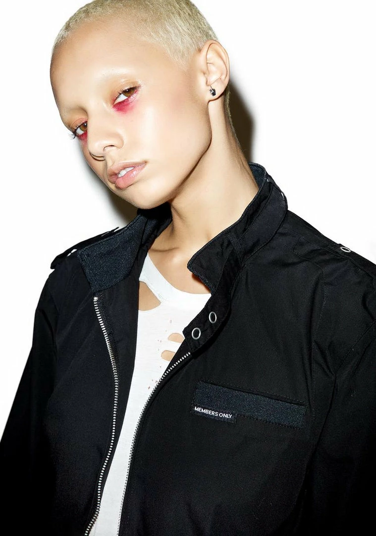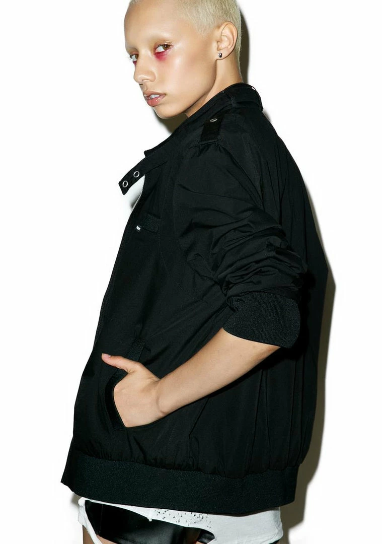 just try and keep up, bb. This supa classic racer jacket is keeping it 100 mph with its jet black aesthetic and nylon exterior. Fully lined, this bb has multiple pockets to hide yer speeding tix, and snap button epaulets on the shoulders. With a snap detail at the collar and full front zip, and rib trimming detail, this bb is going at an ultra light beam speed.