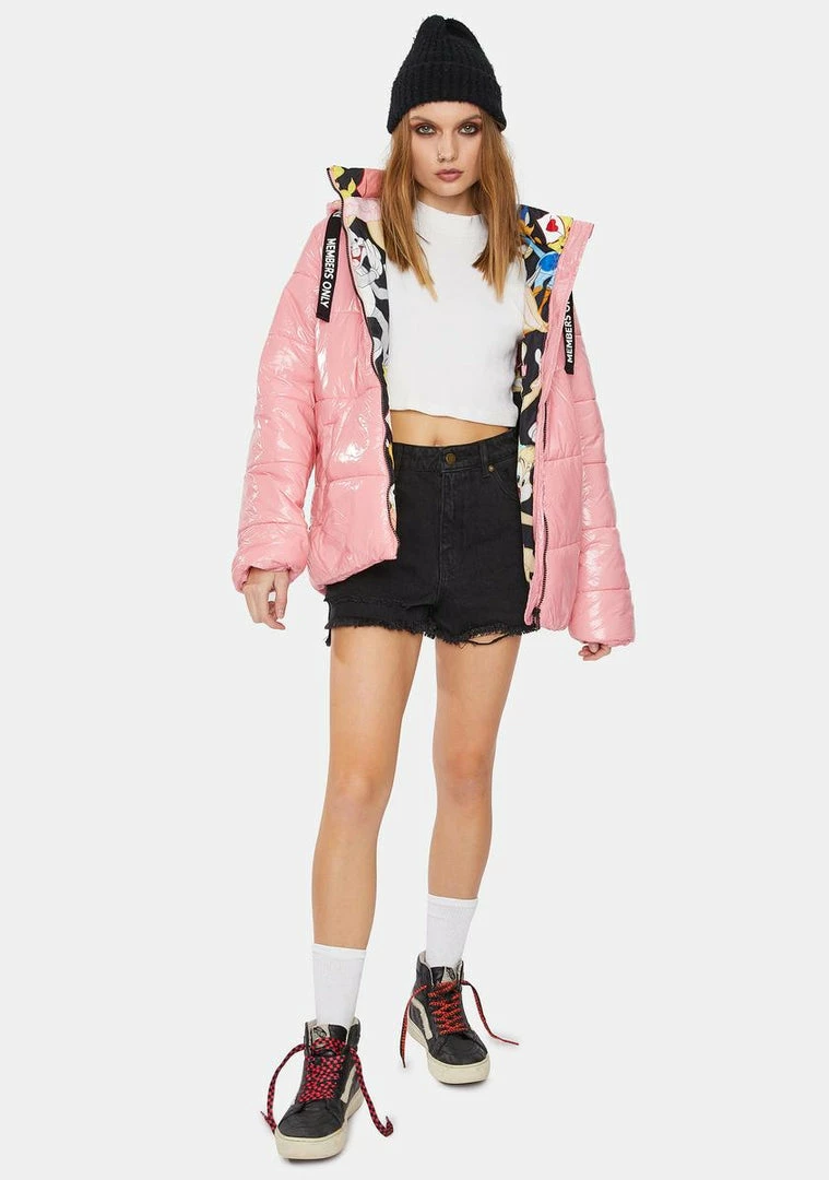 features a chevron quilted design, hi-shine look, a Looney Tunes character printed lining and embroidered Looney Tunes logo at the sleeve, and a Members Only printed drawstring at the hood.