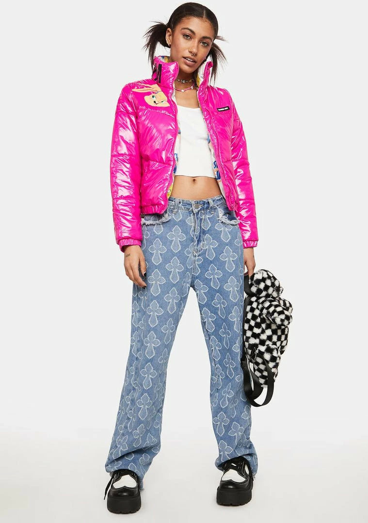the perfect 90s throwback. This cropped puffer jacket has a shiny nylon construction, a high neck collar with ‘Space Jam’ lettering, a Lola Bunny graphic on the chest, two side pockets, a Space Jam printed lining, and a front zipper closure.